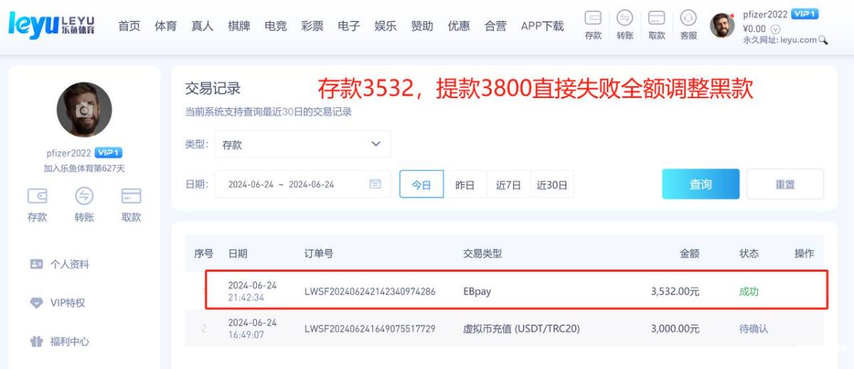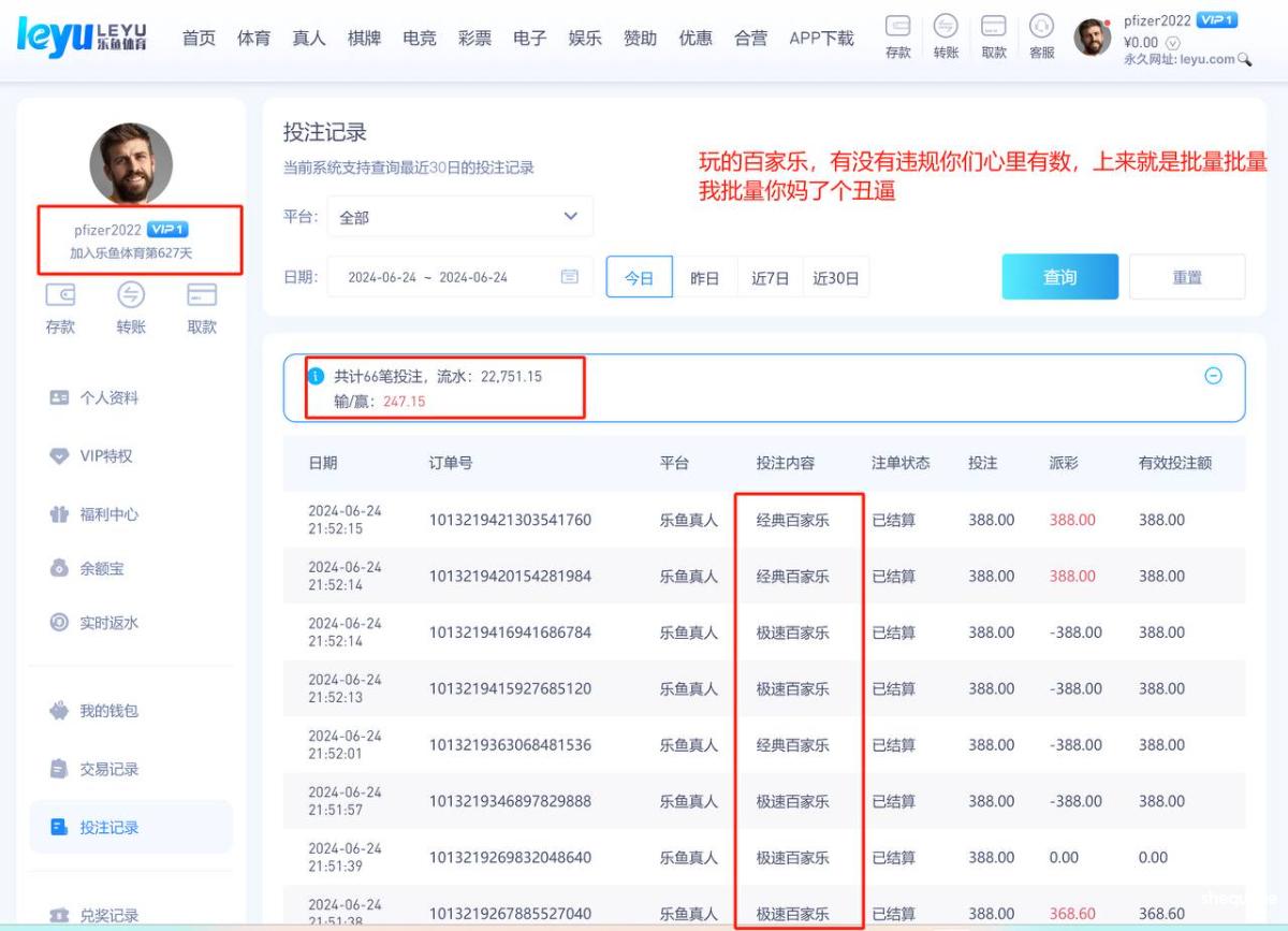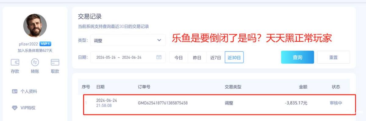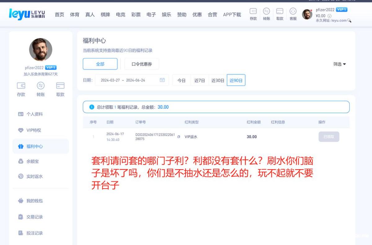 627天的乐鱼账号pfizer2022,这两天重新登陆准备打欧洲杯,充了3500打百家乐,赢了300块钱居然直接失败全额调整,说批量刷水套利,请问都什么年代了你还刷水,刷的哪门子水?你不用抽水的?套利套的又是哪门子的利?利就是30块钱的反水?周红包,回归礼包都没领你给风控?乐鱼是所有平台最黑的,请各位擦亮双眼,远离黑平台。正常玩家在乐鱼你只要玩的好,流水上去了然后没什么输赢,他都能把你的反水,红利全部调整掉,没错这个台子就是这么的玩不起,毫无下限可言,他甚至把黑本金也黑的如此的理所当然,你只要这个手机号码绑定了其他平台,他就认为你有关联多平台玩家,黑你没商量,黑你多少是多少,黑到就是赚到,毫无底线的台子,令人作呕