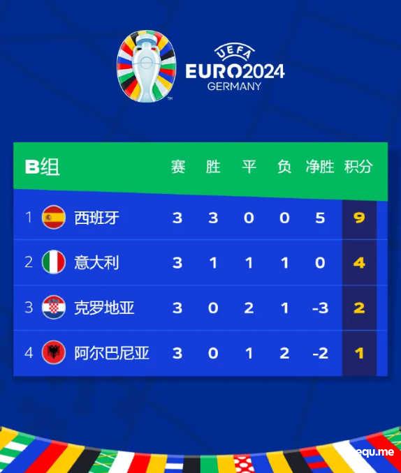 欧洲杯小组赛B组第三轮战罢,西班牙1-0击败阿尔巴尼亚,送对手出局的同时,斗牛士三战全胜小组第一出线,意大利补时读秒绝平克罗地亚,以小组第二名的身份晋级16强。