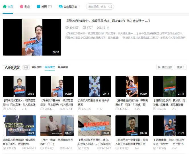 在“中国反诈骗联盟”的真面目被揭露以前,它是反诈领域的“领头羊”。自2023年1月1日的第一个投稿以来,“中国反诈联盟”截至目前已发布近千条反诈视频,其中许多视频播放量都已达到百万级别。
