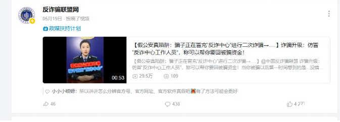 而更讽刺的是,在网友们持续收集相关证据,不断进行举报的期间,“中国反诈骗联盟网”还从其他官媒那里“借”了一个科普“骗子冒充国家反诈中心搞诈骗”的视频——当然,这次的投稿类型也是“自制”。